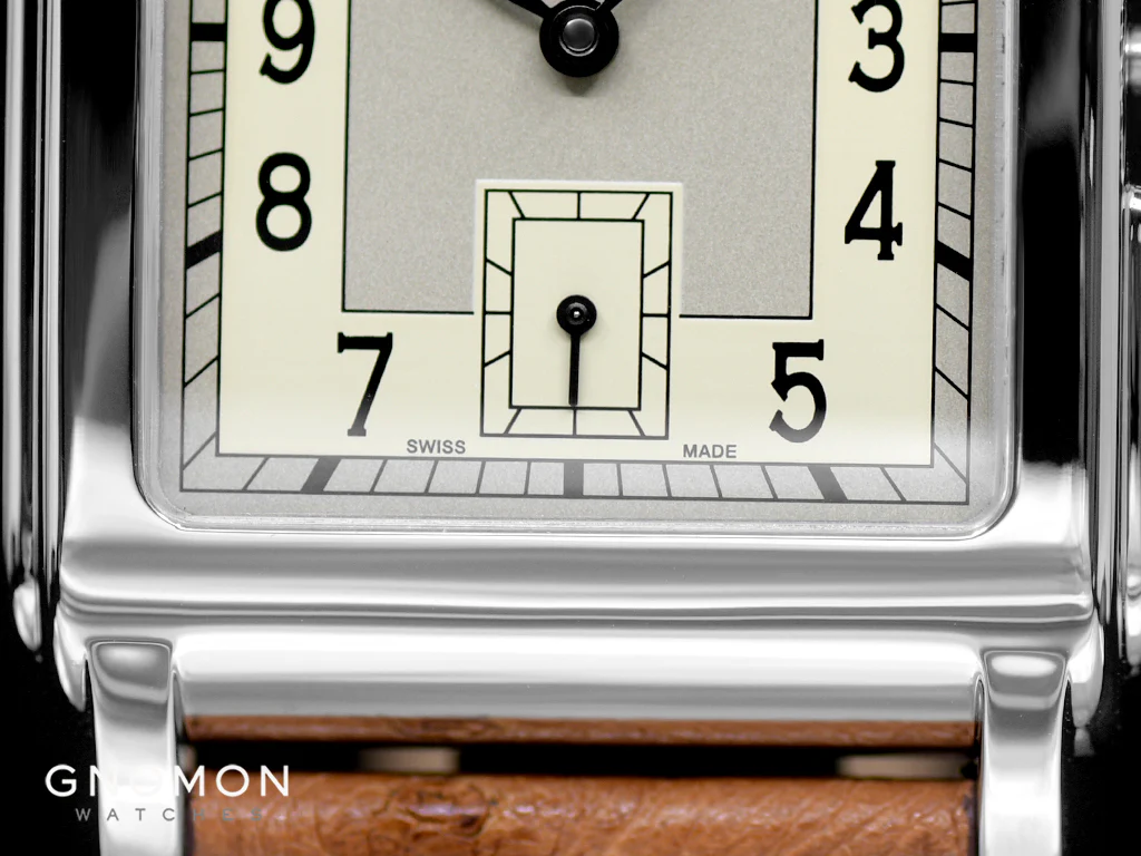 Underneath the sapphire crystal belies a two-tone dial surface, completed with art-deco design that lends an almost architectural retro look. The Arabic hour numerals also work in conjunction with the beige and silver dial, creating a dazzling array of highlights. Alpina’s vintage take on the classic dauphine handset and the sub-second dial at the bottom, gives the Carree collection a sense of refinement on the wrist, especially when paired with the rectangular minute rehaut and the brand’s retro logo.