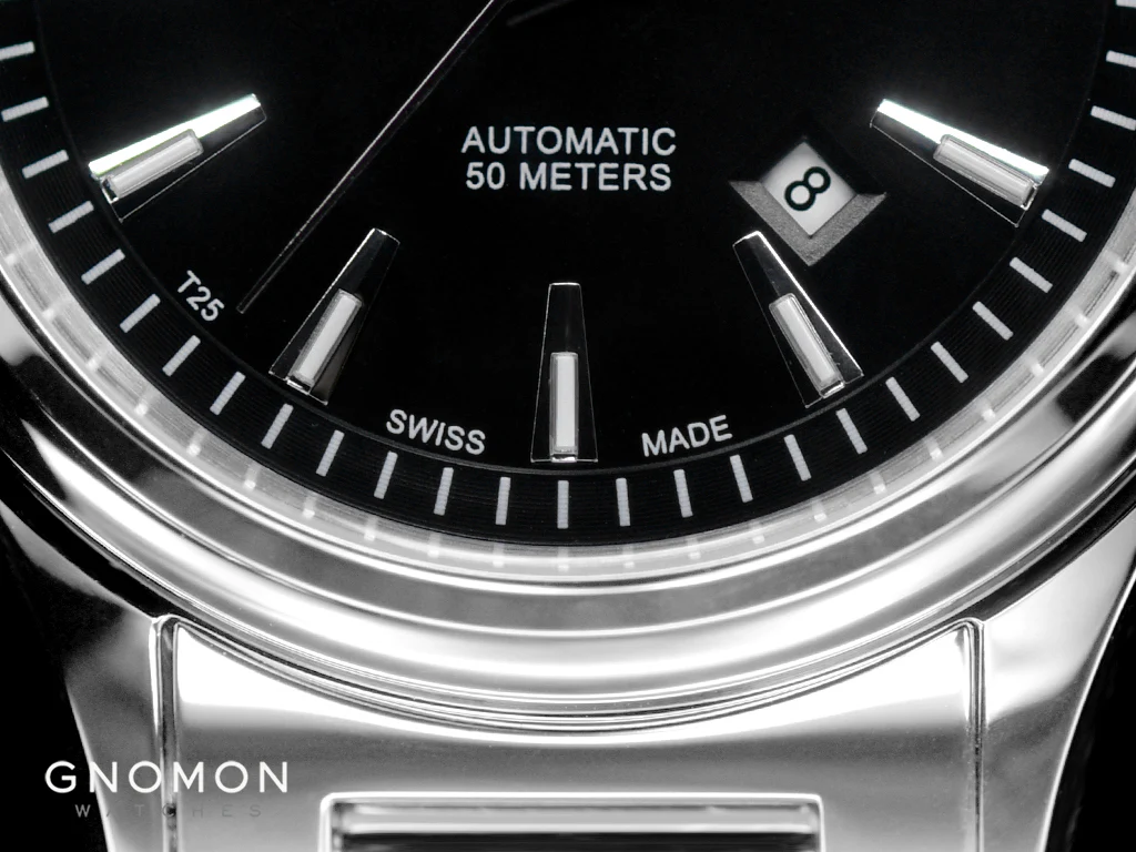 The Fireman Victory Ladies Black is fitted with dauphine hands for the hours and minutes. Both are polished steel and feature long tritium gas tubes. The seconds hand is a thin steel stick with a tritium tube on one end and a "RR" logo on the other end. The attention to details throughout the watch are also shown in the 3 hands.