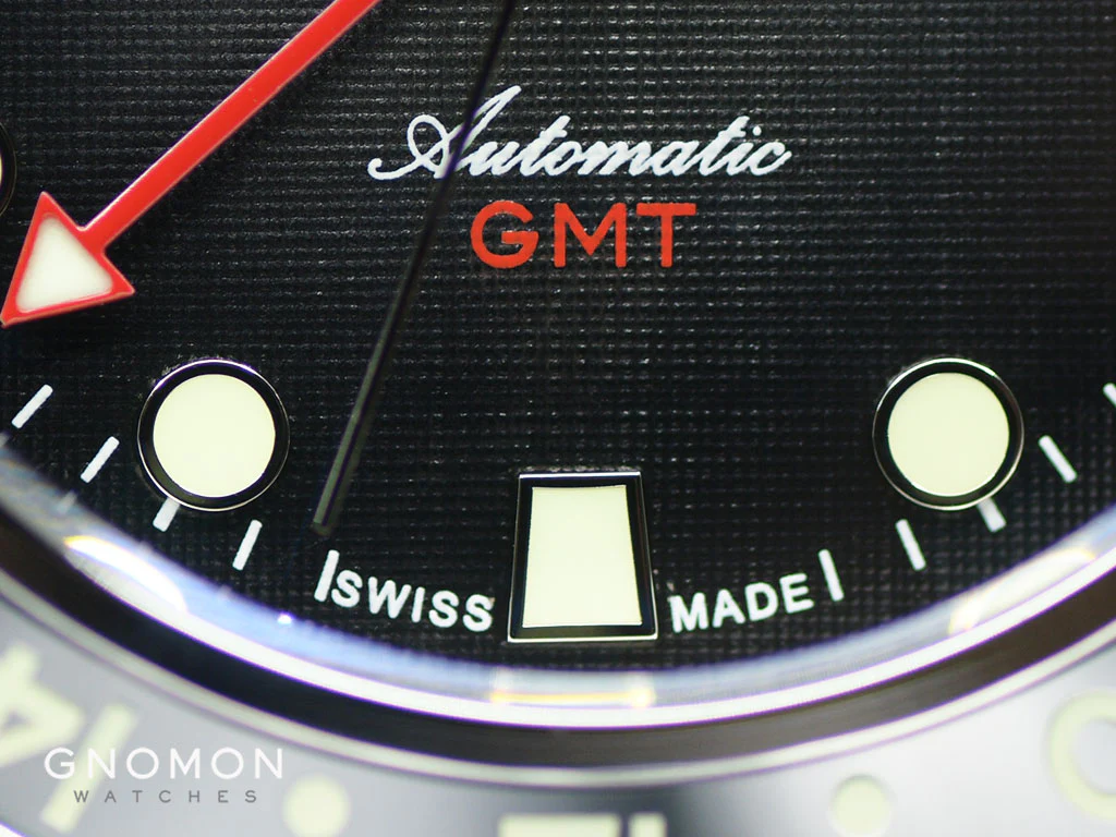 Similarly, the broad cathedral-style handsets, GMT hand and large raised indices on the dial are generously applied with the same C3 Superluminova lume. Night time legibility is definitely one of the strong suits of this piece. One of the most exciting aspects can be found on the dial itself, displaying a beautiful deep black canvas-textured dial, a treat to see whenever you gaze down on your wrist. On top of that, the dial is protected with a scratch-resistant domed sapphire crystal with anti-reflective treatment.