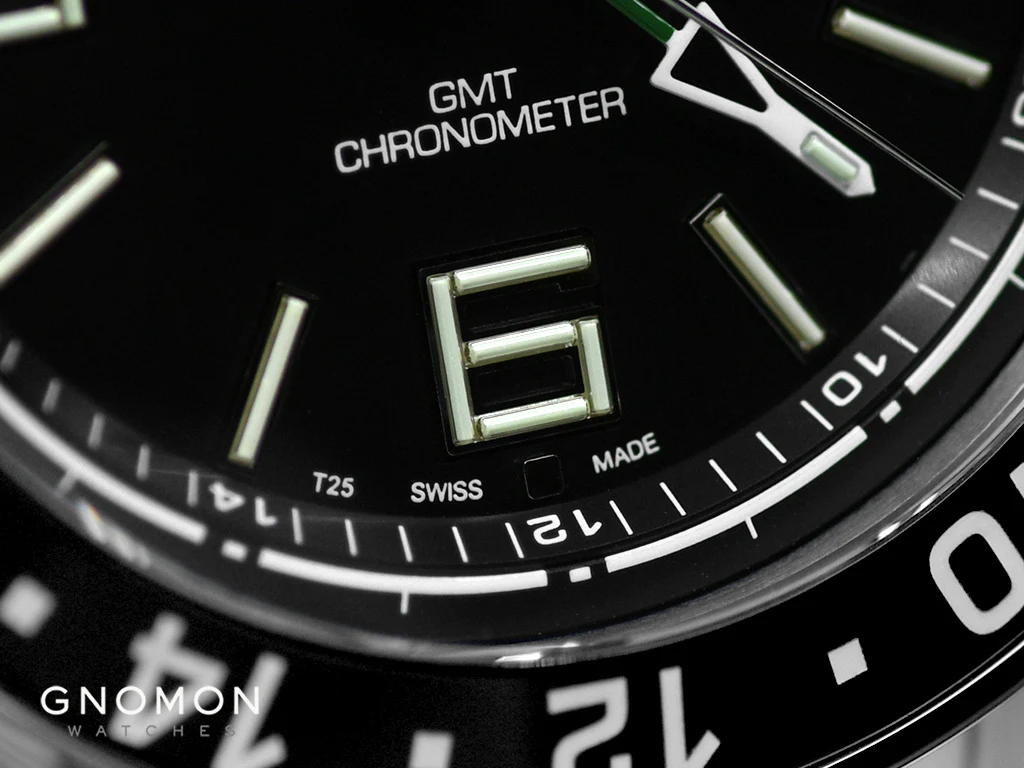 | 28 micro gas tubes on hour, minute and GMT hands and dial for night reading capability |