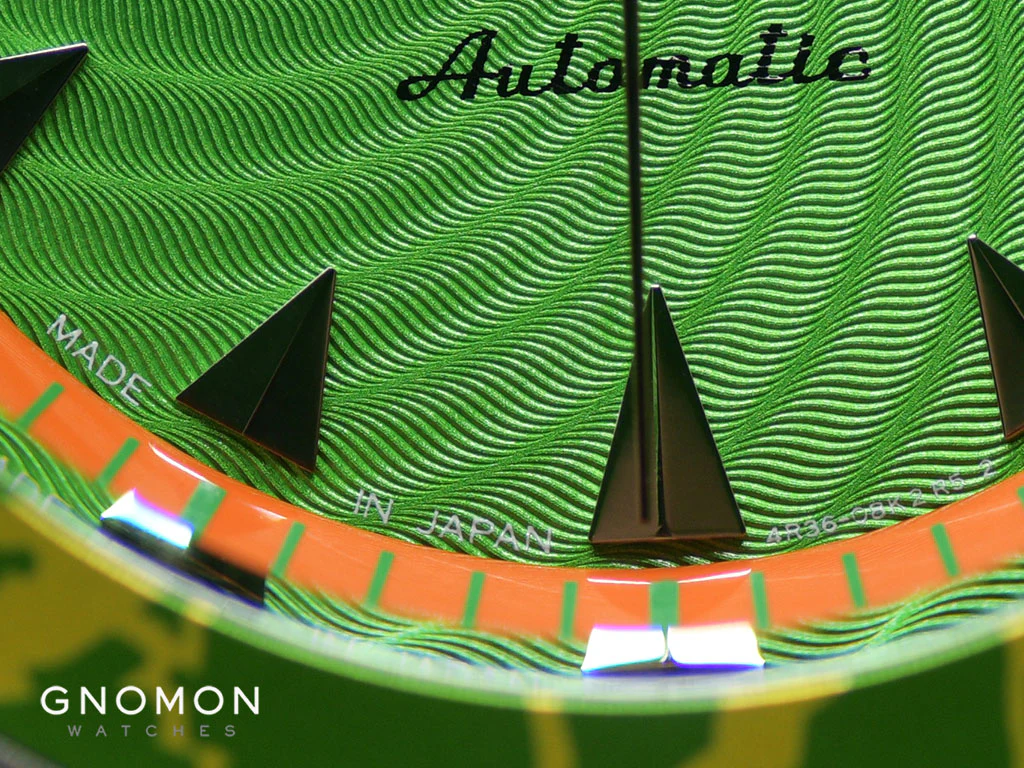 This sunburst green dial also shows off a clear day/date display and its orange handset, accentuated with metal trimmings, is filled with Lumibrite which glows green in the dark. Moreover, this watch is built with a stop second hand function that allows for accurate time adjustments.