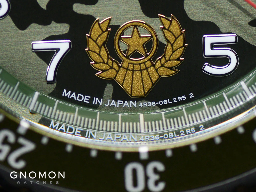 The military camouflage patterns, emulating Guile’s air force uniform, on the dial also shows off a clear day/date display with a golden patch at 6 o’clock. The applied hour markers on this dial as well as its dark green handset, accentuated with metal trimmings, are filled with Lumibrite which glows green in the dark. Moreover, this watch is built with a stop second hand function that allows for accurate time adjustments.