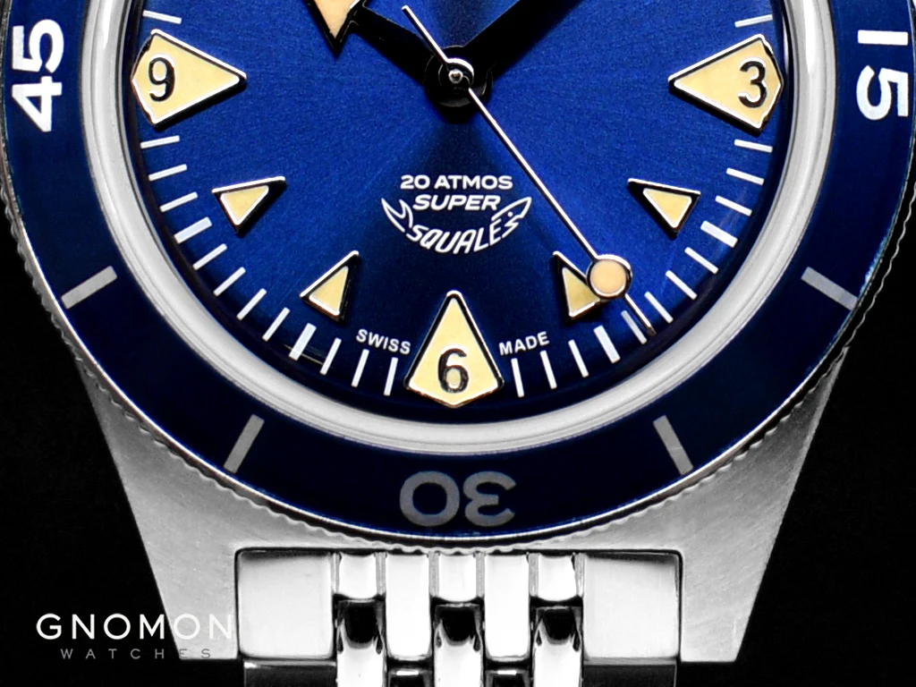 The sleek watch is fitted with a blue uni-directional steel bezel with the diver's count-up scale. The watch features clearly defined triangle hour markers with bigger triangles with numbers 3, 6, 9 and 12 at their respective position. Together with arrow hands, which are both treated with luminescence, the Squale Super-Squale Big Arrows Blue Bracelet – Gnomon Edition offers high legibility in all lighting conditions. As an upgrade from the plexiglass of the past, Super-Squale is fitted with a double-domed sapphire crystal for optimized clarity in time-reading. Compared to plexiglass, the sapphire crystal also offers more scratch resistance. The polished sunray blue dial adds a dash of elegance and charm, while working hard with all the necessary functions of a dive tool watch.