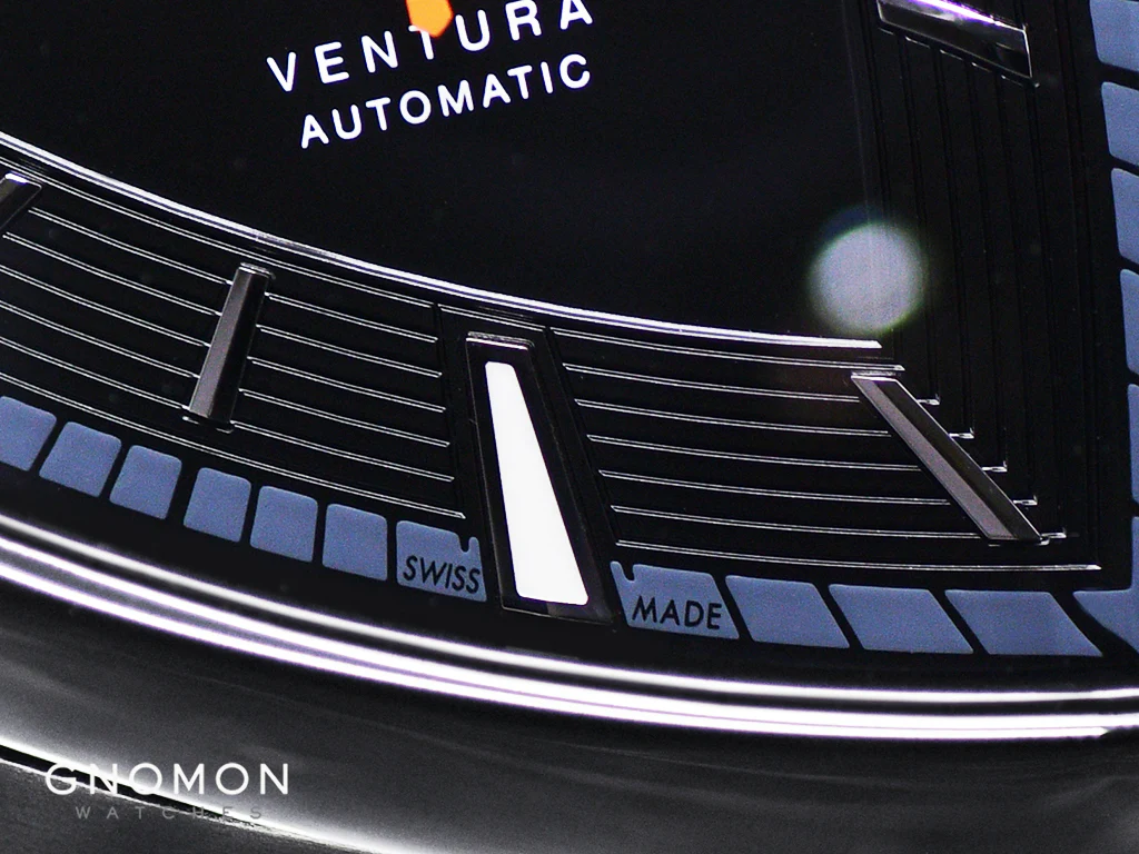 The Ventura's innovative case silhouettes stay faithful to its original, featuring a full PVD black "boomerang" case shape that measures 42.5mm wide and 44.6mm from the top down. The triangle case provides the wearer comfort with these dimensions, including the legless design, allowing the strap to flows out of the case seamlessly. Since it bears an unusual case shape, the domed sapphire crystal with anti-reflective coatings specially molded out to fit perfectly with the case. The Ventura features 50m water-resistant, which seems fitting. Besides, it was supposed to be able to go to Space and rock on stages, as opposed to the aquatic expedition.